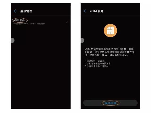 1、在 华为穿戴 app主页点击 通讯管理 > eSIM 服务 > 前往开通。